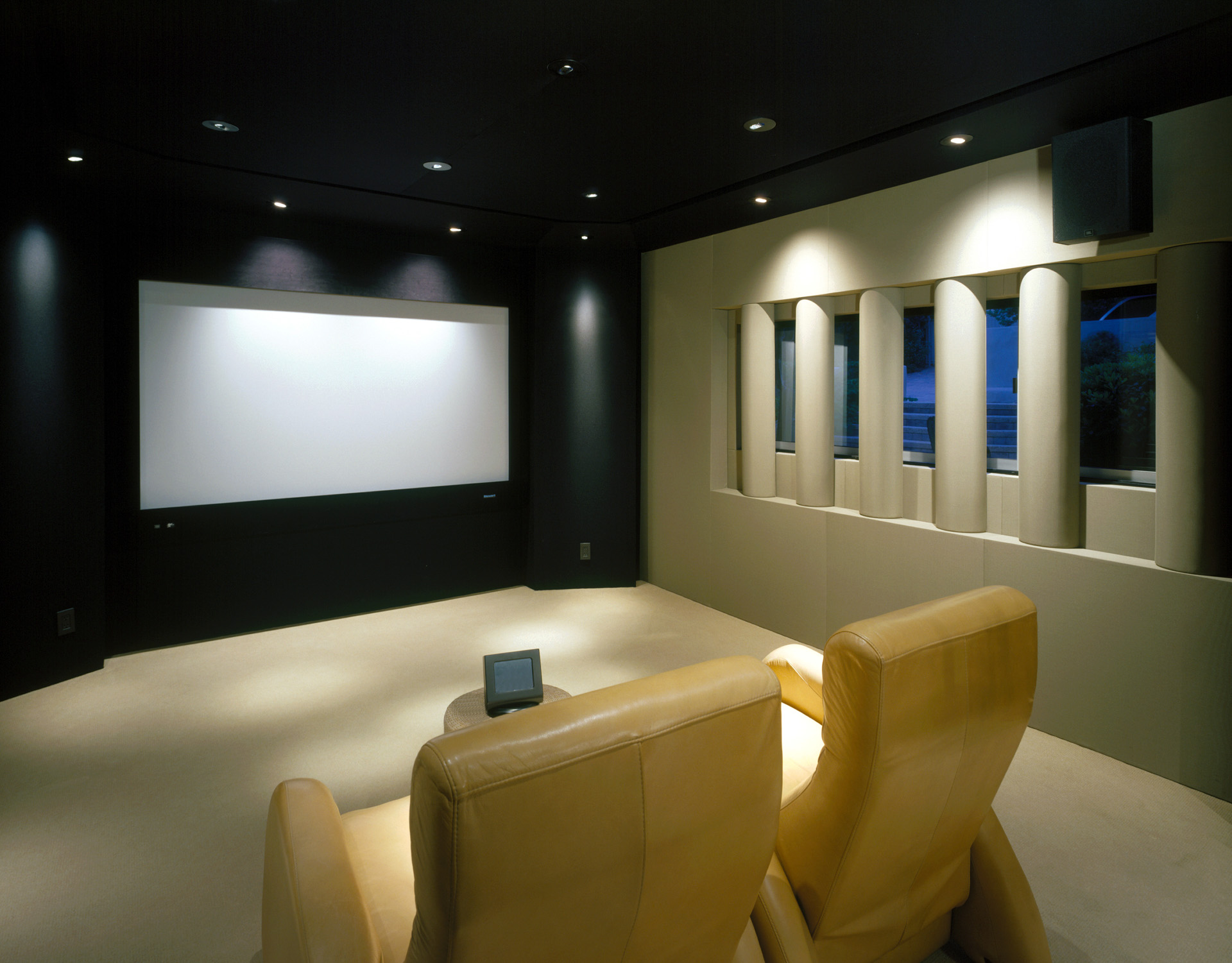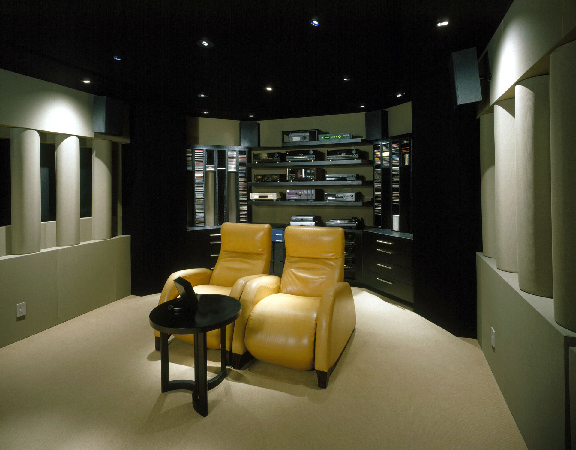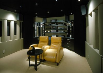 After having designed a 5.1 editing suite for his company in Nashville and media room in Beverly Hills, we were engaged to design a state of the art home screening / 5.1 critical listening room in his new home that was being totally renovated. The space was a former dining room and posed several challenges, ergonomically, environmentally and acoustically. By nature of its hybrid purpose, our goal was to create a take-your-breath-away home screening room and at the same time design a second “sweet spot” for 5.1 critical listening while adhering to ITU, THX and ISF standards in a 21′ by 15′ space. The client wanted to keep the window on the right, so half round nine-inch parabolic columns were chosen, creating an acoustic lens that was duplicated on the left side of the room and incorporated the entrance door as well, making it invisible when the door is closed. The floor used a radiant heating system that allowed us to float the bamboo floor on a foam membrane for tactile bass enhancement. The ceiling was elegantly implemented as a carefully calculated low frequency absorber with a six-inch reveal around the soffit perimeter that allowed the cooling system air to drift down avoiding the need for any grillwork. The rear equipment cabinetry was designed to maximize media storage and provide ambient diffusion and was built in front of a modal absorber for the length dimension. The custom JBL Synthesis 3 sound system performed as follows for the three basic one- button programs on the Elan remote control: Button 1) Movie Mode – LCR horns on / side and rear dipoles on; Button 2) Concert Mode – LCR tweeters on / side and rear dipoles on; Button 3) 5.1 Music Mode – LCR tweeters on / rear 110 degree soffit mounted speakers, tweeters on – listener in forward “sweet spot”. The client has stated that he and his wife never expected to enjoy the room as much as they do. He uses it for his work during the day and he and his wife watch movies most evenings.