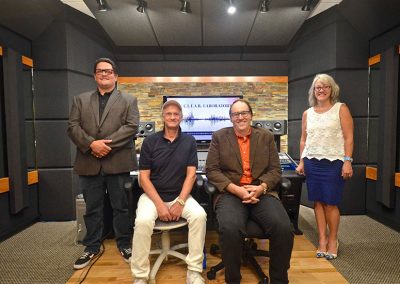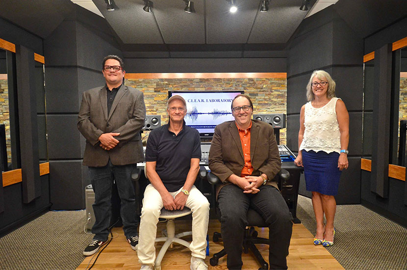 Pictured L-R: Adam Batrich (Music and Arts Technology Alumni), Carl Tatz (studio designer) sitting in the PhantomFocus eChair™, Dr. Doug Bielmeier (Studio Manager/Assistant Professor) and, Dr. Debra Burns (Department Chair, Music and Arts Technology), in the new C.L.E.A.R. Lboratory PhantomFocus MixRoom™ at Indiana University – Purdue University