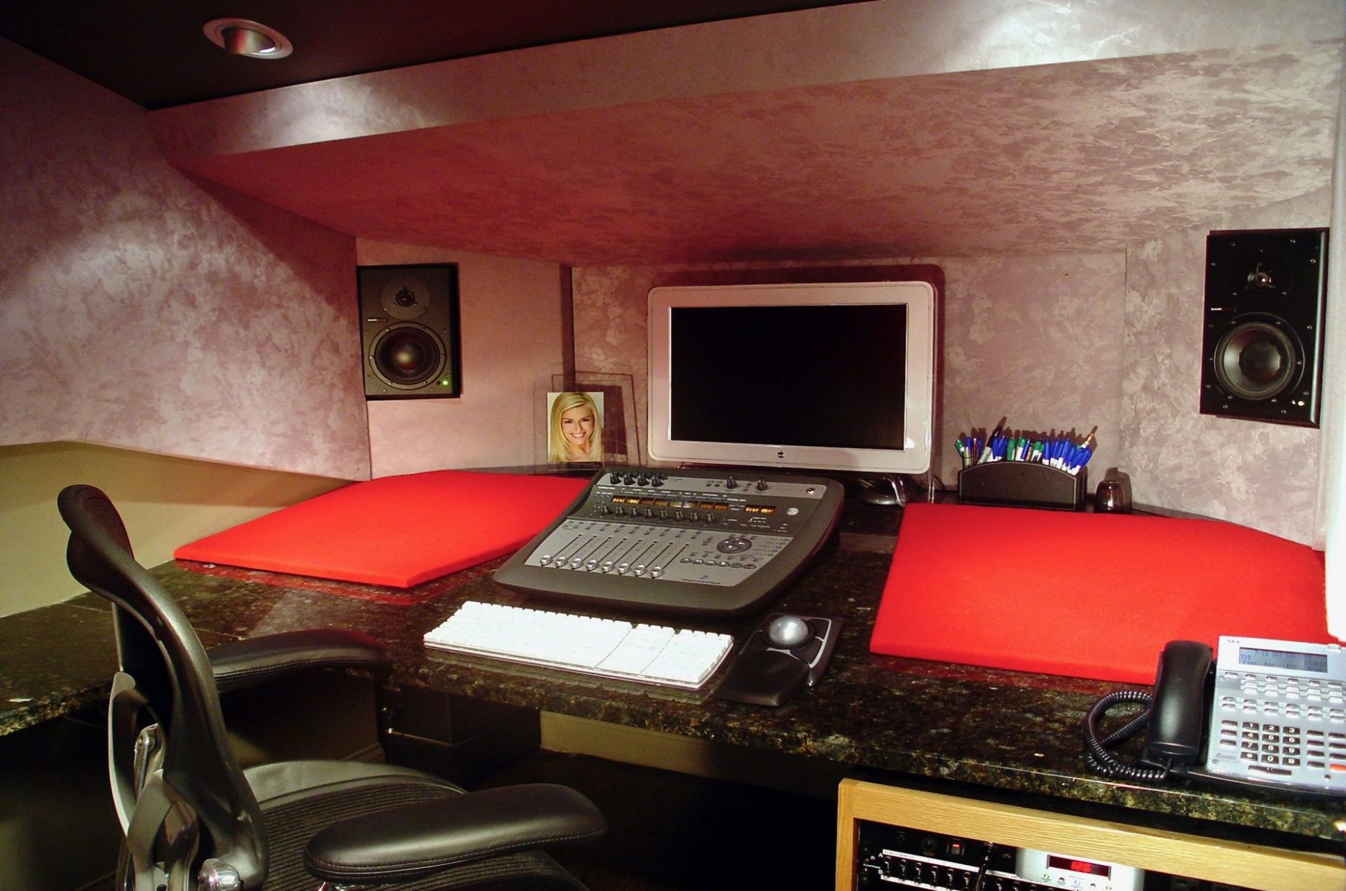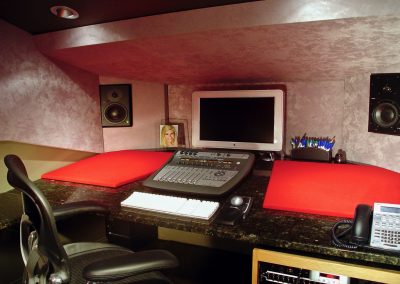 As part of Jay Demarcus’s The Grip studios, The Cock Pit was an afterthought idea of what originally was to be a small private office. Jay wondered if it could be made into an editing suite. I paused for a couple of seconds and then suggested that we could install a PhantomFocus System™ in it and we were off and running. Needless to say that creating a world class 20Hz to 20KHz monitoring system in a space that was 7’ wide, 9’ deep and had a front wall 4’ high that vaulted up due to the roof line was a huge challenge. The sweet spot is nothing short of daunting and was a favorite topic at a recent AES lecture. When I showed the transfer function frequency graphs on the power point screen of before and after the protocol was implemented, there was an audible gasp from the audience without them even hearing the room. That was a lot of fun.