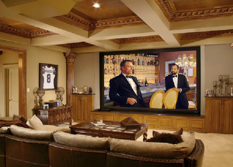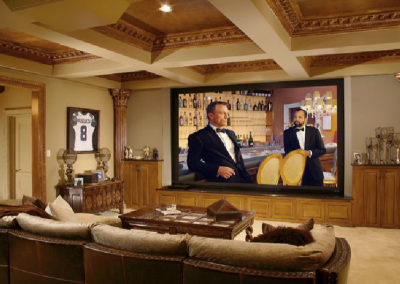 “My family and I are huge sports fans with our son having his eye on a career in pro baseball. Carl was able to design a spectacular screening room in our large comfortable den using the entire existing wood paneling for the screen wall. Words cannot describe the look on our boy’s face when he watches a professional ballgame in HD on an eleven-foot wide screen with a sound system so immersive you’d swear you were at the stadium.